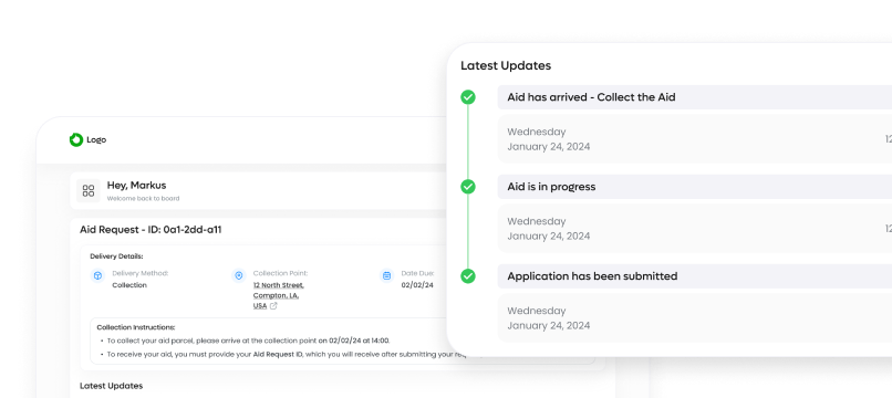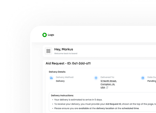 Beneficiaries can easily request aid through a secure, multilingual interface that ensures clarity and dignity. Each request is tracked transparently, enabling timely updates and building trust.